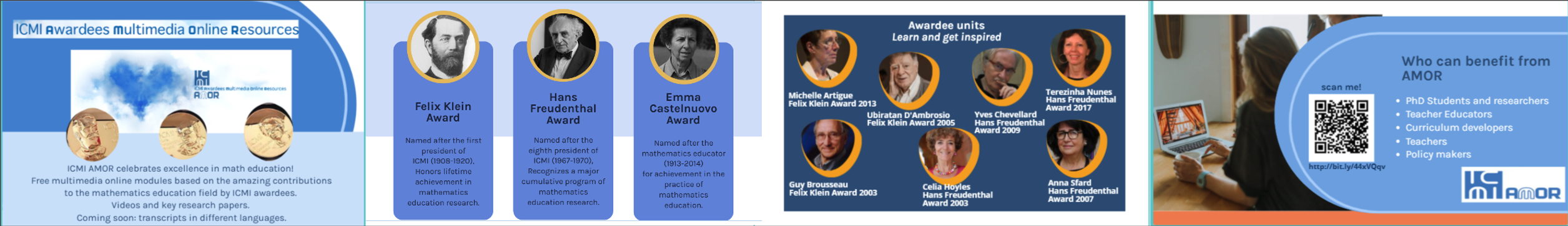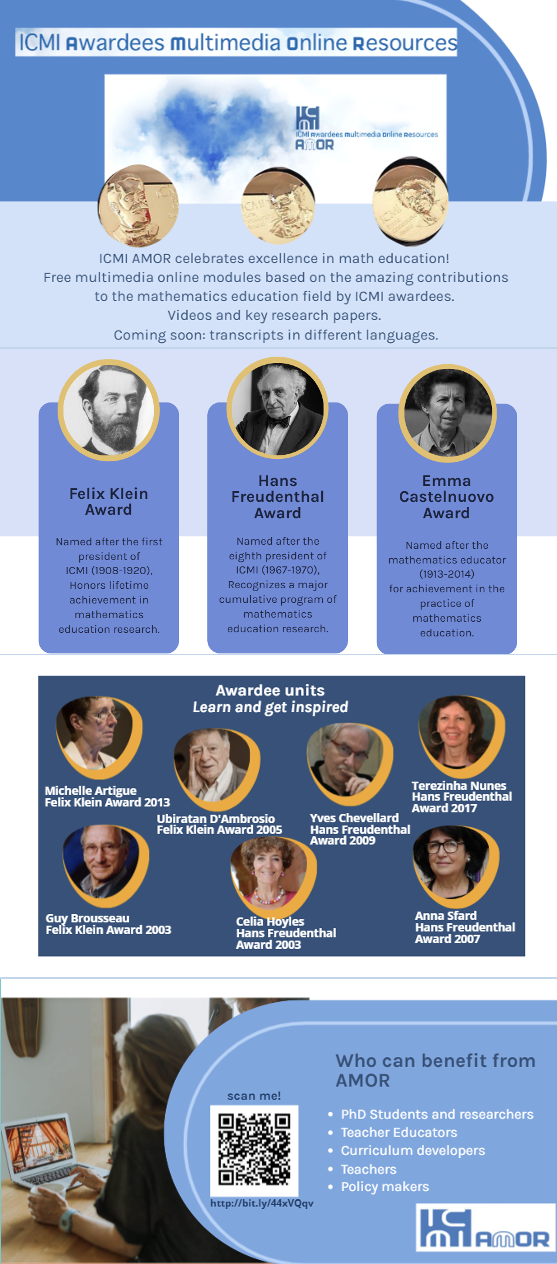 ICMI Awardees Multimedia Online Resources Project. The ICMI AMOR Project, initiated in 2017 by Jean-Luc Dorier, aims at building online resources reflecting highly significant and influential research in mathematics education at an international level, which could serve as a reference not only for researchers in the field, but also for educators, teachers, curriculum developers and policy makers and other agents in the field. In particular, the project could serve as a basis for a PhD training program and induction into mathematics education research. In this presentation you can have a quick glance at the videos in the units of the project. You can also access a flyer and posters here and here.